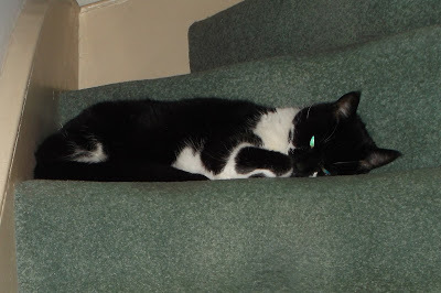 Merlin came downstairs, obviously miffed to find the mini intruder still in residence. Maggie spotted him and thought he might play with her, if she pranced around close enough to him. No chance. He let out his best angry howl, his back arched, trying his best to look as menacing as possible. All this was lost on Maggie, either she wasn’t impressed or didn’t know what the hell was wrong with him.