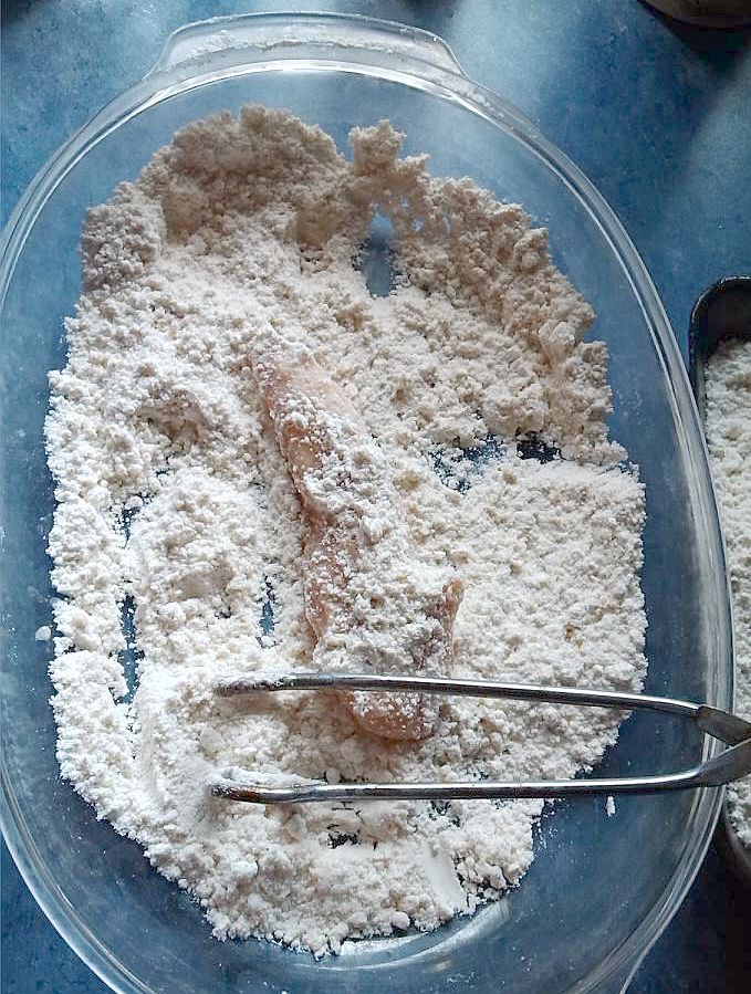 5. Now, dip chicken into egg/Dr Pepper® mixture, then coat with flour crumb mixture. Place on cookie sheet.