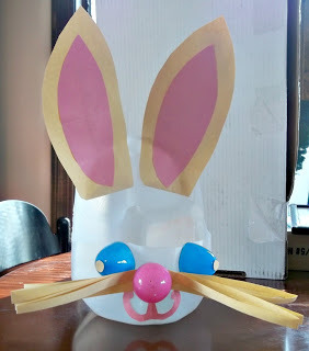 The bunny whiskers pictured are made from construction paper. Fold a piece of white paper in half (you determine the size needed), start at the OPEN end and cut down toward the fold. Our whiskers are about 1/4" wide. Leave about 1/4" uncut near the fold. Now, fold them over in half lengthwise to give thickness. At the folded end of each whisker, hold and push to open the whisker in a bowed shape. Glue folded ends together and glue to your bunny. This is a great technique for a kids's bunny mask too.
