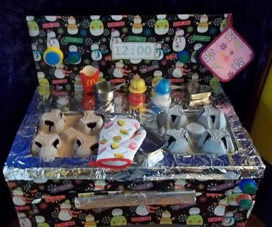 Cardboard Pretend Stove with all the Recycled and Upcycled bells and whistles, ahem, knobs and handles.