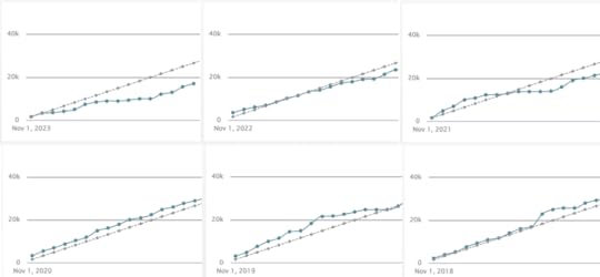 Kui mul ei oleks kümne õnnestunud NaNoWriMo kogemust, oleksin ma praeguse NaNoWriMo juba pooleli jätnud. Ja isegi selle kümne õnnestunud kogemusega ei ole lõpetamine sugugi garanteeritud. Kui soovituse järgi võiks 12. novembriks olla kirjas 20 000 sõna ja mul on 10 044… ning kui see joon muudkui eest ära kerkib ja minu sõnaarv järgi ei jõua… Sellist kuristikku ei ole varem tekkinud. ning nüüd selles istuda on ikka jube õudne küll.