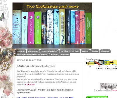 Die liebe Verena hat auf ihrem wunderbaren Blog The Bookdealer ein sehr schönes Interview mit tollen Fragen mit mir geführt. Nachlesen könnt ihr es hier.