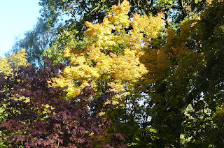 Lovely Autumn, coloured leaves and skies, such different colours from summer sunsets, cooler and more changeable. Nights are closing in and it's getting dark around six p.m. instead of eleven-ish. My favourite evening walk with the dog is in a valley and Autumn is time to change the walk to midday when the valley still has sunlight and warmth.