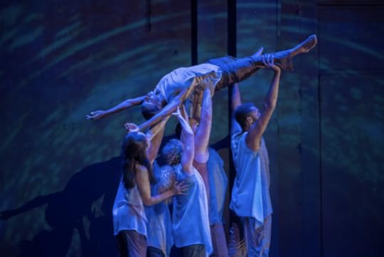 Water, the next section, started with a solo by bass clarinet, that most human tonality of reed instruments, and a kind of Gregorian chant choral singing by the band. This accompanied a marvelous duet between two of the dancers, marked by explorations of pause and flow. The dancers slowly spun in parallel and then flipped around and over each other with a deceptively easy grace. An especially evocative moment was when one of the dancers held the other on the hip in a slow spin, so that both seemed weightless for a moment. Then they came back to earth, leaning and twisting around each other, always in control but always at the edge of imbalance, like currents coming up against the banks of the river, bouncing back, hinting at the undertow. This watery movement suggested the beauty of water but always with a hint that something might at any moment overflow and overwhelm. This element so essential to tranquility, peace, nourishment, survival, can also, with more force, more pressure, destroy everything in its path.
