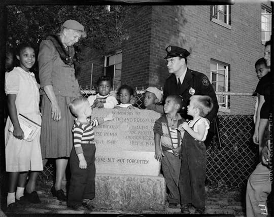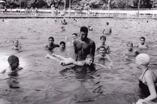 Sometimes one person’s eyes in the photo give us a clue of its larger historical stakes, as if they were the tell in a poker match, particularly one about the unfinished project of racial justice in America. A striking images captures a white police officer scowling at First Lady Eleanor Roosevelt as she towers, like a gazelle, over black and white children gathered around a stone memorial for her husband Franklin Delano Roosevelt. In another image, from 1951, a muscular African American teenage boy holds a younger white child aloft in a pool during a swimming lesson. The young white boy looks like he might be about to fly, supported by the older black teenager, who looks down in concentration. Others children, black and white, seem to be posing for Harris. It is a scene of racial integration, with a sense of possibility to it, but Harris has caught a moment when one younger African American boy in the foreground of the photo looks on at the scene sourly, skeptically, registering suspicion with an out of sync side eye.