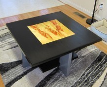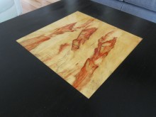 My wife and I recently moved into a new house. The living room was very empty, so we decided that I should build a coffee table to fill it up. As I’m very new to woodworking, I was unsure of the species of wood to use for the table. I brought (dragged) my wife along to the lumber yard to get her input on the matter. She saw a piece of Box Elder, in all it’s red splotch glory, and suggested (decided) that it should be incorporated into the table. I ended up resawing the piece to 1/2″ thickness in order to make the 18″ inlay. I finished it with marine Waterlox, it looks like glass–very cool! I heard that I should use something like this with UV protection or the red splotches would turn brown.
