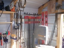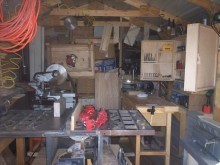 My shop is quite small at 108 sq ft. It’s actually a 9′x 16′metal storage building, of which 3′ is used for storage! I have the following tools snugly inside: 13″ planer, 40″ lathe, 12″ sliding miter saw, shop-made router table, small compressor, table top drill press, 5′ workbench w/vise, 6″ jointer, 10″ bandsaw, a couple of clamp racks both long and small, a wall-mounted shop-made storage cabinet, and a 10″ table saw.