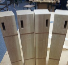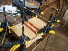 The idea of a colour scheme was always an idea but the rest of the wood in the room is Ash so I couldn’t really put a lot of Mahogany with it. So after thinking it out, I came up with the idea of the Mahogany inlay on the outline and it turned out very well. I also put inlay on the 4 legs. This was the most challenging as it took a lot of time to cut about 40 pieces—32 to go into legs and 8 spares. I left the inlay slightly proud of the surface and sanded it flat to give a good tight even finish.