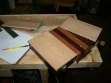 The construction of the box was rather easy. It was nothing more than building a frame, cutting it in two at the table saw, then gluing the top and bottom planks on. After I had the main box done, I cut some grooves around the edges for the purple heart trim. But where it got tricky was the interior. My friend wanted me to make it look like it came out of the 1800s. I knew I had to make thin planks of wood for the interior, and that I had to use double bevel marquetry to inlay the spikes on the game board. So after I inlay the spikes, I left the boards in my bench to warp a bit. This technique if you can call it a technique, worked out great. Before they warped anymore I glued them to the box leaving a good gap on all sides which I later filled with trim.