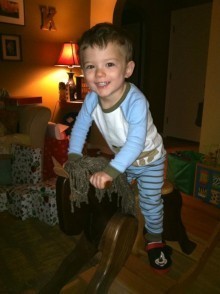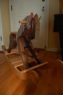 I searched all over the internet for a good rocking horse plan. I wanted to build one for my son (first child) and ended up finally getting if finished to give to him for Christmas last year. Off and on it took 2+ years. Kinda hard to work on it when the shop is in the basement. I usually had to help take care of him when he was awake and when he was asleep, I couldn’t work on it. He loves it, as you can see from a picture taken Christmas morning!