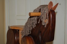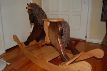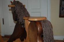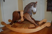 I built the horse out of walnut and everything else is oak. The mane and tail is yarn. I put on 2 coats of clear danish oil followed up by 2 coats of clear poly. I made sure before doing the poly to write with a sharpie on the bottom To, From and the year. In between coats I lightly rubbed it down with some steel wool. Thanks for taking a look.