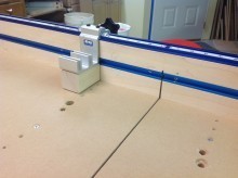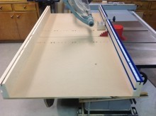 This is a table saw sled that I designed, adding many features that I have never seen on a table saw sled. I added a Kreg precision track and stop kit to the top. I had to modify the rear fence to accept the kit. This setup lets me set the length of the piece just by setting the stop at the correct measurement on the built in tape measure. I also added a t-track to the face of the fence for future jigs. The sled rides on Incra 25.5″ long special edition miter slides. These slides are adjustable for zero play.