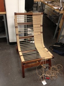 The chair is composed of 6 bent laminations, 4 for the frame and 2 for the seat. Each laminated frame member consists of 28 plies cut at a thickness of 1/16th of an inch. The relatively extreme bends of the forms drove the thickness of the plies and less the idea of wanting to disguise the process of lamination. A series of stretcher bars, six in total, were placed between the left and right side of the frame to prevent racking and set the overall width of the chair. A secondary design idea was trying to disassociate the frame and the seat. In many of the works of Poul Kjaerholm, a technique of placing spacers between the two so that they could be read as 2 separate entities was employed. Beyond simply looking nice, this would help me solve a later design challenge of weaving the seat.
