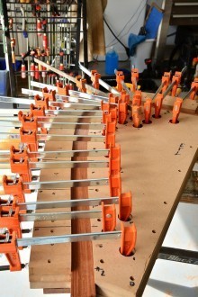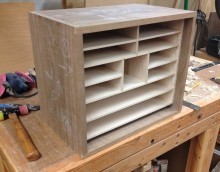Next came making the maple gallery and drawers, which went quickly given the work on the prototype. I put the drawers together with rabbet joints since they are small and won’t take much abuse. The drawer bottoms are plywood which will be strong and stable and covered with felt. I don’t like the look of the nylon-polyester-whatever cheap felt you see so much of and a little research produced natural wool felt which is harder to find and more expensive, but much nicer to the eye.