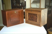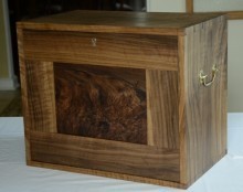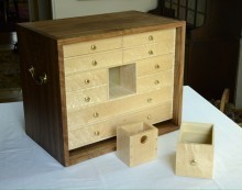 The chest has a removable, lockable door on the front with a matching fixed panel on the back. I’ve done some veneering, so I knew I could do eye-catching center panels for the doors. For the prototype I used maple burl veneer. I made the poplar case with box joints which are quick and easy and solid. The gallery took a lot of ‘futzing’ with, but in the end, wasn’t that difficult, just required precision. I was able to knock out the drawers quickly and with my growing comfort with hand planes, I was able to fit them pretty easily.