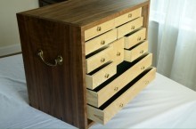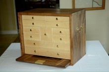 Mari and I talked about what Jason might like and appreciate in terms of wood, details and size. She sent pictures of his collection, so I had a good idea of the need. The Gerstner chests have a few different sizes and styles, as well as different drawer configurations. I liked the idea of a chest that would lock (keep the kids out) and was portable to easily carry around to show off the collection. Jason is a budding woodworker, so I wanted to build it in a way that he would appreciate—dovetailed case, gorgeous wood, ‘close to the wood’ finish, attention to detail.