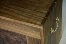 I definitely wanted a finish that would show off the wood. I liked what I had seen of the Masterpiece Wood Finish, from Highland Woodworking in Atlanta. Its a 3-part finish process: a base coat made with special oils that penetrate to seal the wood and enhance color and grain; a mid-coat blend of oils and waxes that fill the wood’s pores; and a top-coat paste wax for additional sheen and luster. Definitely not for a table top or ‘hard use’ situation, but great for this. For the drawers, I used a clear shellac for a little shine to highlight the maple.