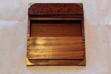 I finished up bending the brass I had cut for the edges and then it was time to get the base glued up. Again a challenge without sufficient clamps, but I managed to get it together. It is not 100% square and if you look closely you will see all the little irregularities. For the finish I used Woodoc No10 which is an indoor polywax sealer, applied with a sponge. It gave a velvety look which I really like.