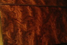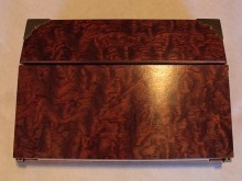 It is made from Sapele Mahogany. The top is veneered with Waterfall Bubinga and the writing surface is leather. When finished properly, the waterfall bubinga really looks like flowing water. It is probably one of the most beautiful woods out there and I try to use it whenever I can. This piece was hand-rubbed with a couple of coats of oil, and then polished over with some Renaissance Wax to give it a nice smooth feel.