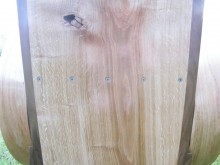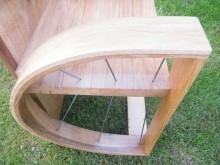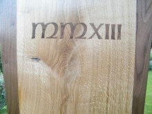 The chair is built mainly of oak, a massive 20” wide 7’ tall board fills the back. Along side of that are two boards of walnut. The seat is also one board, originally 2” thick. The seat and the back had to be flattened by hand plane. The two are joined by a hidden dado and bolts with threaded inserts, a impeccably strong joint. The arm/leg is two separate parts of steam bent oak, laminated together. There are also stainless steel cables to add another dimension and detail. These are crimped at either end inside the lamination. The writing is 2013 in Roman numerals, and is a router-based inlay.
