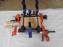 I’ve seen many with the inset lid hinge-pinned after construction, but I wanted to hide the pin. So, I trapped the 3/16 brass lid hinge pin in during glue up. This is a lot harder, trying to hold everything together: pinned lid, biscuited miters, inset bottom and so on while trying to attach the clamps. A lot of small pieces coming together at once.