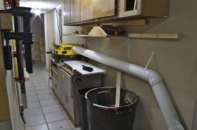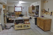 Right to left again, the kitchen area is where I store most of my “junk”, finishes, and chemicals. This area stays in a state of organized chaos so I figured I would leave it as is for the picture. Having access to a sink in the shop is something I have grown very fond of. When the time comes to build my own shop I will definitely have some type of running water in it. I also have my modified Harbor Freight dust collector in the kitchen. To eliminate the need for a decent canister filter I modified the unit to incorporate a the in baffle right below the motor and ported the exhaust air outside. The duct work is half 4″ Sewer and Drain PVC and half 4″ flexible hose. This runs back to the miter saw, out to the table saw station, and into the hallway for my planer station.