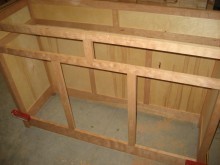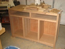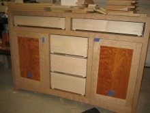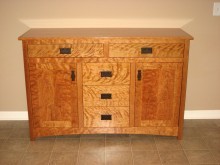 The cabinet door panels are resawn curly cherry. I used cherry plywood for the panels that make up the body of the piece. The interior and dividers inside are also cherry plywood. The top is solid curly cherry.