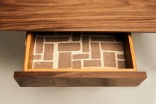 The rails were cut with a round shoulder to fit the diameter of the turned legs perfectly. Slip tenons were used to assemble most joints, with sliding dovetails rounding out the remainder of the joinery. The top is bookmatched walnut veneer on MDF. The drawer I suspect is of butternut and it rides on full extension maple drawer slides. The lining of the drawer was hand printed and stitched by my wonderful friend, Tamsin, who is studying textiles at Sheridan.
