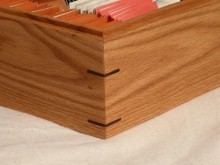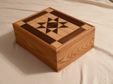 I couldn’t find a tea box plan that I liked, so I just adapted a Woodsmith Magazine plan (August 2010 – Issue 190) I had. I basically just followed the plan with two adjustments. I increased the height of the box to provide enough clearance for the tea bags, and I simplified the decorative top pattern for four of the five boxes. The one you see here is my wife’s box, it follows the quilt-top pattern from the original design. The other four boxes used a simplified pattern made up of nothing but rectangles to save time. I forgot to take pictures of those boxes before we sent them out.