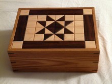 The pattern on the lid is 1/4″thick pieces of red oak, walnut, and maple glued onto the plywood top. I spent a lot of time with a shooting board trimming those pieces to fit! Each of the pieces has a 1/8″ roundover on it. These create shadow lines to help hide any small gaps, and actually the plan recommends having just a tiny bit of wiggle room to help with the final fitting. The box is finished with a beeswax/mineral oil finish.
