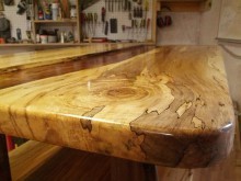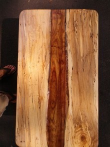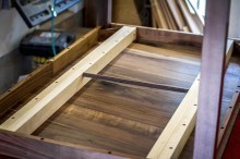 I liked the idea of the live edge table, but I also know that I like to put my feet up on a coffee table so I knew that a live edge spalted maple board would break under that pressure. Also, spalted maple has gorgeous grain along the edge and I didn’t want to lose that. I decided to take the board I had bought and join it with a piece of Chechen along the live edge. I cut a dado along the length of the board and then hand carved both pieces to ensure a good fit. The walnut legs are mortised into the top and the bottom is 1/2 lapped into the bottom shelf. The bottom shelf is spalted beech split down the middle with a walnut piece biscuit joined to the 2 pieces.