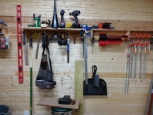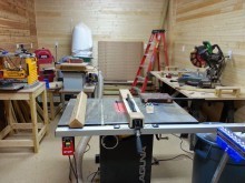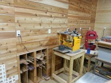 This is my small shop in my basement. It was the storage room and it’s about 22ft x 12ft in size. I used garage floor paint to make it easy for cleanup. I recently had it wired up with 20 heavy duty outlets that can all be turned off with 4 switches at the door. I also added a 400 cfm exhaust fan. Started out by putting cedar on one wall, but due to money constraints, I had to finish up with some wood paneling from a big box store. I added some wood storage under the stairs. All walls have Roxul Safe-n-Sound insulation in them to help eliminate sound going upstairs.