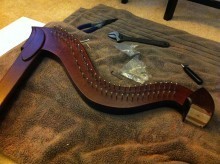 I decided to stain the maple, and after many samples, ended up using GF Rosewood water based stain as a base coat with an added coat of Dark Brown water based dye. I left the birch ply natural. A little gold leaf was added to trim the sound box and back, followed by a wipe-on satin polyurethane as a finish.