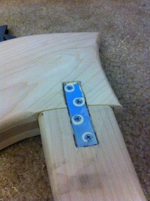 I used hard maple for the sound box, neck, and pillar, and Baltic Birch plywood for the soundboard and back. The neck and pillar are both made of laminated maple. I used three layers of half inch solid maple with the center layer laid out at 90 degrees to the outside layers to give strength, as the neck of small harps in particular must withstand almost 1,000 lbs of tension from the strings. The neck/pillar joint must also resist the pull of the strings to one side of the neck, so in addition to the overlays called for in the plans, I added metal brackets recessed into the neck and pillar. The top of the neck at the soundboard is kept from falling over by an extra 1.5 inches of hardwood. A dowel keeps this block centered on top of the sound box while stringing; the bottom of the pillar is held in place by two wood screws. The entire neck and column are built to lean away from the strings about 3 degrees. Besides the dowels and screws, the only thing holding the harp together is the tension of the strings. The neck/pillar assembly is removable in case it needs repair in the future.