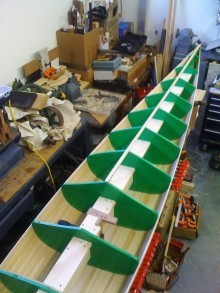 The station molds were purchased in December’09, materials were gathered to build the strong back, and the strips for the boat were milled in the shop at the school. The first strip to build the boat was applied to the molds on June 19, 2010.