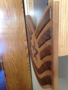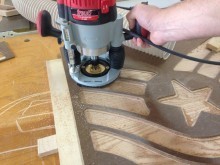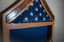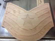 The Box is solid White Oak with Black Walnut inlays which stand about 1/8″ proud of the surface of the Oak. I used an inlay bushing and bit kit with homemade templates (those took a while to get right) to cut the inlays. It measures 42″ X 22″ and is 4.5″ deep. I also mounted a challenge coin showing his rank right into the center of the star. I used a multi-tongue and groove joint bit to make the lower panel. To join the rest of it together, I used pocket hole screws and homemade dowels from project scraps to plug the holes.