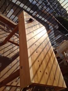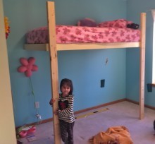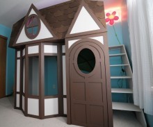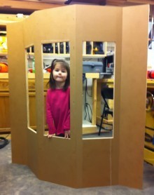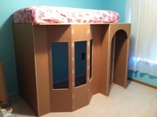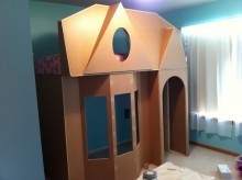The first thing was to set the height of “roof line” where the mattress would sit. Her mattress platform has a special place in my heart—my dad built it in 1985. I used it throughout college as my bed loft and now she is using it. It just feels good to keep using it. The platform is attached to the back wall and is supported by the front wall of the house. The 2″x4″s in the first picture are strictly there for initial support. Next we built the main walls. Everything was constructed out of MDO plywood, a great material to work with and so much easier than MDF. The bay window is held together with dominoes.