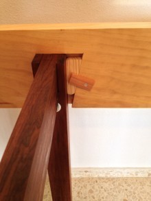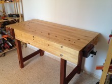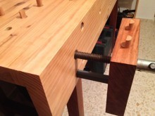 The leg assemblies are static, made of Bangkirai and Ipe. The top is 5′ long with laminated and finger-joint-extended lengths of pine. The primary vise screw was procured locally, the support is simply a square steel pipe with a mortised through-hole for a guide, and the jaw is made of Sapele. The secondary vise was re purposed from a sub-par MDF bench (and will likely be replaced in a year or so) and uses a Bangkirai jaw with a Purpleheart dog. The dog holes are 20mm with matching dogs made from dowels. The top was finished with 6 coats of varnish and the legs and jaws were treated with linseed oil.