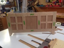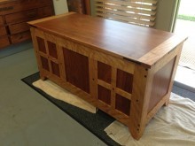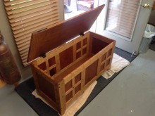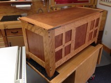 The idea for this project was a birthday present for my daughter. While it is not a terribly complex build it started out to be a much simpler Shaker/Mission type design. After many drawings and looking at assorted different photos of chests things got a little more elaborate and challenging until I came up with this design. One of the things I wanted to accomplish with this project was to use more hand tools and fewer power tools and very few mechanical fasteners. The addition of the Greene and Greene style details came late in the construction as an after thought really, my first attempt. I was happy with the look but wish I had added a little more in the design. The stiles, rails, and breadboard ends are Curly Cherry and the panels, top and bottom are Pensylvania Cherry that was cut from a 12/4 piece that was approximately 21″ wide and about 8′ tall. The panels within the fields were pre-finished before I assembled the front, back and sides. The biggest challenge with them was gluing up all the joints and inserting all the panels before the glue started to set. For that I did use a special slow set glue from Garrett Wade that worked very well.