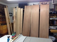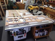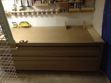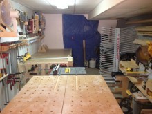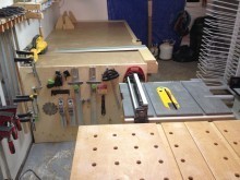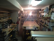 Paulk’s workbench and mitre stand are still the centerpoints of the shop. For another work surface that is as close to the Festool MFT as I can currently afford, I doubled the plywood storage top. I bought a drying rack from Richelieu instead of making a shop one; it works reasonably well. For a lumber rack, I used cheap support brackets. I still use an auto-start Dewalt dust extractor for dust collection, as well as general cleanup. My drill press, second router table, jointer and planer are stored where possible and brought out for use. Not exactly ideal, but for now it’s functional. I’m presently building an entire kitchen, so cabinet storage was pushed over into the utility room.