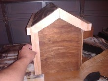 The main body of the library is made of 1/2″ pine plywood. The sidewalls and bottom are connected using dado and rabbet cuts, glued together and brad nailed for good measure. Similarly, I mitered the top and bottom edge of the roof panels and cut dadoes to join the roof to the main body. I lined the exposed edges with 2″ x 1″ pine for a cleaner look and to provide an extended overhang to prevent rain from entering the housing.