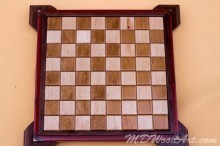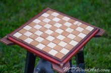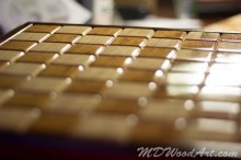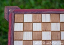 I really love the way Intarsia wood projects look, and I really love playing chess. I thought it was time to make my own chessboard. The tiles were cut one-by-one then rounded over on the tops, sanded by hand, buffed and then glued individually to a 1/4″ backer-board and then framed with solid wood edging. The frame for the board was designed as I went, using what I had in the scrap bin.