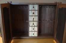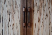 Interior—This looks pretty much like an Iron Maiden with lots of pegs for maximum storage. (Hopefully things won’t get too tangled up in there!) Of course, I couldn’t stay away from what was left of the resawn spalted maple, so I book matched more veneers being careful to account for the drawer shelves and get the grain to flow smoothly up the bank. The panels for the back on either side of the drawers are also book matched.