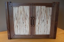 The Doors—I got my spalted maple online from Spirit of the Woods. I felt I got really lucky with board I chose. While there were parts of it that were a bit punky, the portion with the best spalting that I used for the book-matched panels was good and stable. I cut 1/16 proud veneers and contact cemented them to ¼” oak panels. Just seeing how well those turned out had me really excited for this project! I went with full overlay doors using through mortise and tenons. The mortises were cut on the band saw, and then cleared with a chisel. Tenons were done on the table saw. I really liked Marc’s variation on the rail-stile configuration that carried and matched the grain across the rails, so I carefully chose wood to get the arched effect on the upper rails.