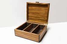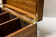 After completing the box, it was time to cut the lid off. I used my table saw with a thin kerf blade and it was a lot easier than I thought, LOL! I used the quadrant hinges which proved to be a bit of a challenge, but after 4 or 5 tries on scrap wood, I felt confident and had no real trouble on the actual box. I lined the inside of the box with Pig Skin Suede which I got from a leather shop. It smells amazing! I decided to use the suede since I wasn’t going to get the smell of Cedar, I wanted something nice when you open it, and it really did the trick! I may be using this for any boxes I make in the future. It was easy to apply—just brushed wood glue to the surface of the wood, applied the suede and then pressed it down with a straight edge. One little trick I used and really liked was to line the bottom panel during construction of the box, that way the seams are perfect.