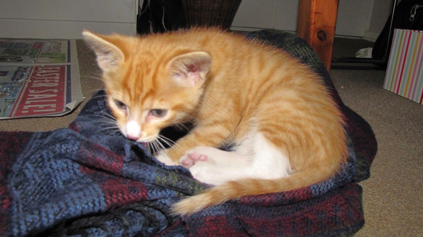 His name is currenly Caramel and I'm tempted to keep it, but will he forgive me when he's a grown man swaggering around the house? My eldest daughter wants the name Pumpkin, my aunt has suggested Marmalade, and my mother's contribution is Marmaduke. (A big name for a very little kitten.)