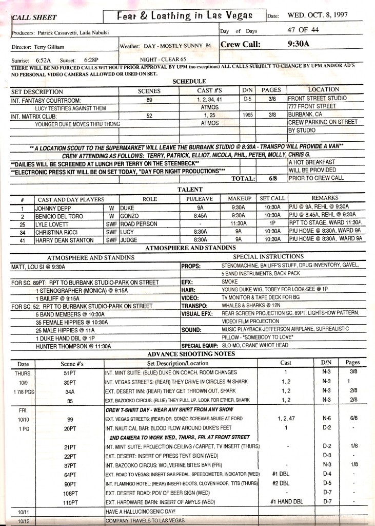 The Call Sheet is the Bible of any film production. It's the document that tells everyone involved in the film shoot, from the director to the lowliest runner to the insurance company covering the shoot, what's being filmed on any given day.