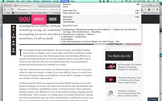 Now I must confess, I still leave more than one webpage open. Here’s a screenshot from the other day and I had six things open. I just use the window menu to switch between the browser windows. (The Mac automatically sorts any open windows alphabetically in the menu which is a very handy feature.)
