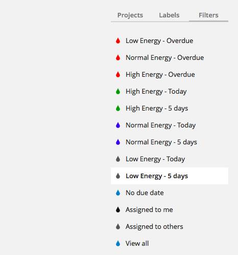 With any task management app, you don’t need to concern yourself with how many projects you have, but the number of contexts (which are basically Labels in Todoist) should be limited because they should represent things that will be around far longer than projects. That’s why locations, people, apps, energy levels, and so on make for good contexts/labels.