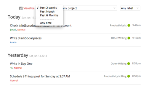 To be absolutely clear, the review settings in Todoist don't allow for a weekly setting. The lowest setting offered is the past two weeks, which means that I actually only scroll down as far as one week when doing this review. For those who struggle with doing a review weekly, the two week option might actually be a blessing in disguise. Using it can really help you develop the habit of regularly reviewing. Todoist's review option also allows for monthly and bi-annual reviews, which can come in handy for taking a look back at what you've accomplished over longer periods of time.